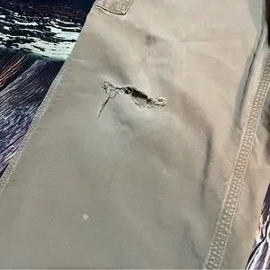 Distressed look with marks and distressing throughout, fraying at bottom, hole near knee