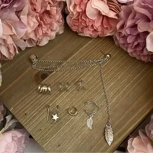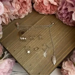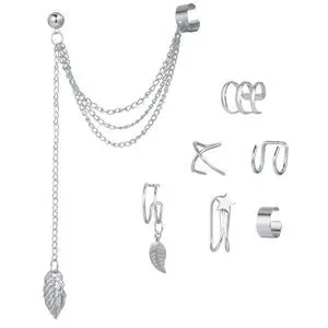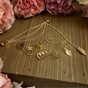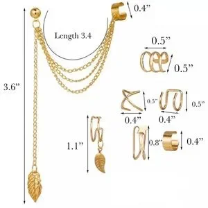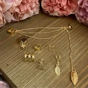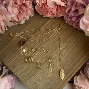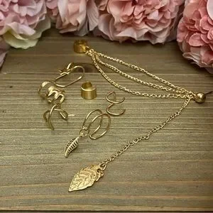 Make a statement with this fun set. The long dangling feather is the only one that requires a piercing, the others just clip onto your ear. From feathers, to a star, geometric shapes and curled cuffs. Mix and match the way you wear these cuffs for a custom look.