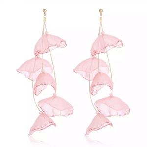 These gorgeous, lightweight, flowing earrings have long tassels with pale pink flower petals cut from fabric that dangle from twine. There is a gold stud at the lobe, with three strands dropping from there, with white beads at the top of each petal. These are the perfect statement earrings!