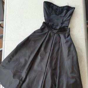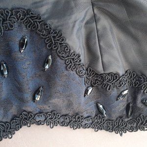 So beautifully designed and excellent quality, this matching set is a timeless classic. Although tag has size 10, this is more of a snug size 8. Gives great shape and has lovely flow. Perfect for formal events or even as a stunning foundation for fancy dress ups, eg a classy Morticia Adams. Gorgeous beading and embroidery detail on corset. Good condition, well made.