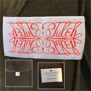 Fantastic designer Tuleh jacket! Collarless 3/4 sleeve jacket with a short cut. Brown wool blend fabric, Patch Pockets & oversized Snap Closures. Self Tie at neck. Partially lined a Tuleh branded fabric. Princess seams. two small pleats in back, seams edges inside finished with trim (nice couture touch!)