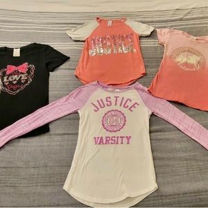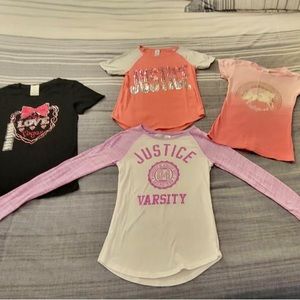 Includes: 1 long sleeve Justice Varsity shirt, 1 short sleeve sequence Justice shirt, 1 brand new with tags black Las Vegas shirt, and 1 rhinestone unicorn Dollywood shirt.
