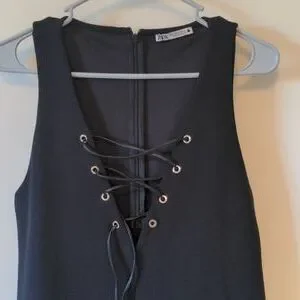 only with once, Zara romper, boxy and cute so kinda looks like a dress. deep V lace up front with silver details and leather faux lace. size small fits me a little loose (27/28 inch waist for reference).