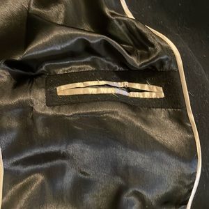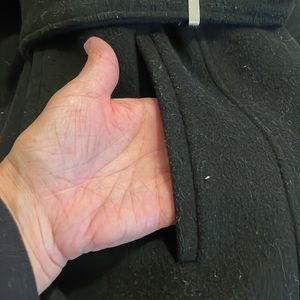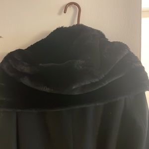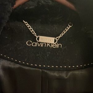 Calvin Klein wool blend belted coat with faux fur collar, inner pocket, zipper up, size small, black. Top button missing (picture number 6)