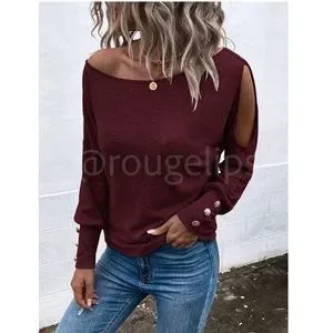 Burgundy One Cold Shoulder Asymmetric Boat Neck Long Sleeve Tee Shirt