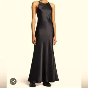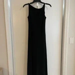 Classic black gown, boat neck with low back and black gems adorning the cinched back. Stunning train. Comfortable fit and classic style. Size 6 and true to size.