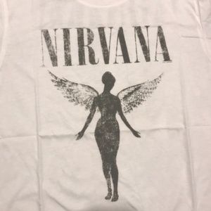 Vintage styled band tee ‘Nirvana’ with winged angel. Soft comfortable material with a little stretch.