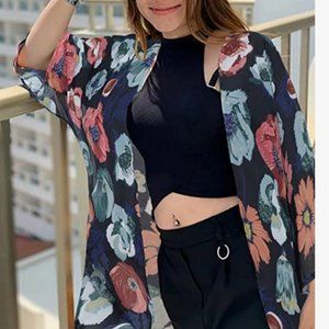 Casual Floral Print Loose Cover Up Kimono Cardigan Blouse Top Black