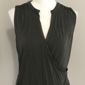 Dark olive green top with beaded accents. Faux wrap style in front. Gorgeous.