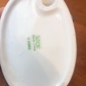 A charming Schmid Bone China figurine from 1982 depicting a playful leprechaun. This delightful piece showcases a leprechaun lounging on a white oval base adorned with raised green shamrocks and a delicate gold trim. The leprechaun wears a festive green hat with a gold accent, a white suit, green striped socks and boots, and holds a gold-accented pipe. His cheerful expression and relaxed pose evoke a sense of whimsy and St. Patricks Day spirit.