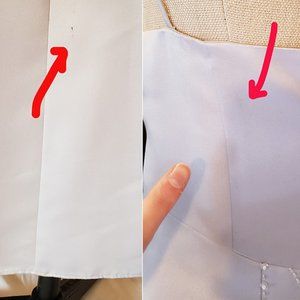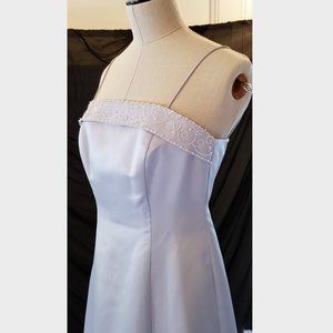 Soft lavender purple formal gown, featuring beaded decor along neckline and vent in back, faux buttons along zipper in back, spaghetti straps, and full skirt. Condition is pre-owned, as there are several stains/spots, mostly to/near the hem of the skirt, but there is a tiny one on the bodice front and a very faint line on the bodice back (please see photos). This gown is stunning and very elegant!