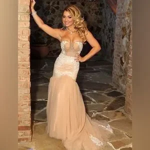 Custom made blush colored strapless wedding gown worn once. I am a size six but this was made in an 8. I am 5’5”. The back is adjustable for any cup size.