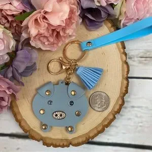 Vegan Leather Dusty Blue Pig Keychain with Tassel and Wristband Loop