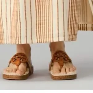 Better than Birkenstocks! Lightweight ergonomic sandals for ultimate comfort. A new addition to Tory Burch's iconic collection, Molded '70s inspired cork sole now lined in cozy shearling. A dual-density foam core for flexibility and optimal rebound. Tory Burch graphic logo — laser-cut with hand-painted edges. Envelopes the foot for a perfect custom feel. — Comfort you can wear all day.
