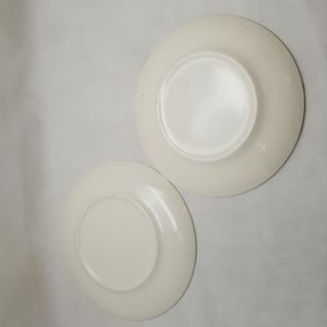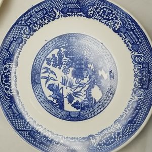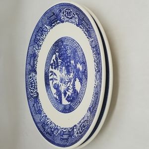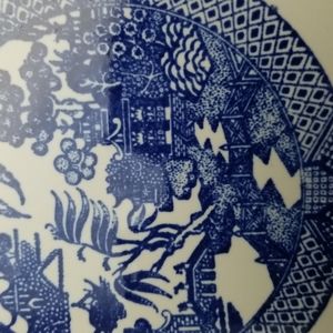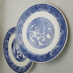 Lot of 2 vintage or possibly antique unmarked Blue Willow pattern ceramic dinner plates. 9 ⅞" in diameter. Both have either fading or just bad transferware as some spots are too light and some too heavy. One has about an inch long unglazed spot, a couple of light scratches, and one plate has a circle crack spot that looks like a chip in the making ( see last 6 pics ).
