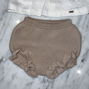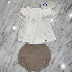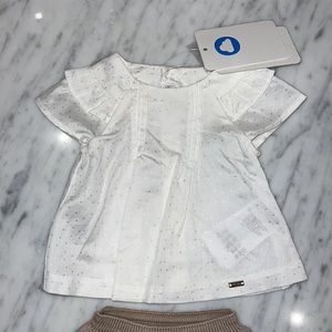 New Mayoral Baby Girls White and Khaki Dottted Top and Knit Bloomer Set. Beautiful little ruffles and pleating on the blouse. All of my items are new with the tags.