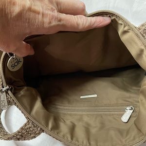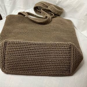 Large purse that measures 12” tall x 12.5 wide and 4” deep. Crochet bag is a beautiful cognac (neutral ) color. There is one outside zipper pocket. The purse closure is a zipper. Interior is also cognac color and has one zipper pocket on back interior wall. Two straps w/ 15 inch drop. No stains or picks but handles have a little wear. Overall good preowned condition.