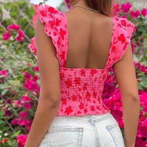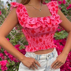 Floral Print Shirred Ruffle Trim Tank Top