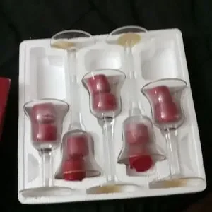 5 piece clear votive holder set with gold rim and red votive candles.