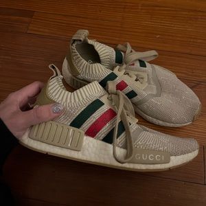 Tan/beige/cream adidas NMD boosts x Gucci collab trainers / sneakers / tennis shoes. Super cute, comfortable, stylish, and always in style no matter the season.