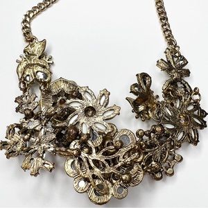 Antique Gold Tone Chunky Pink & White Crystal Flower Statement Necklace