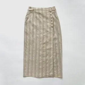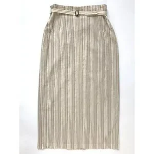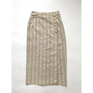 Vintage wrap skirt made in Canada by brand Louben in a soft natural color with delicate stripes. Features side button closure and belted waist with metallic buckle. Entirely lined with satin Material. Please see measurements below.