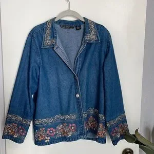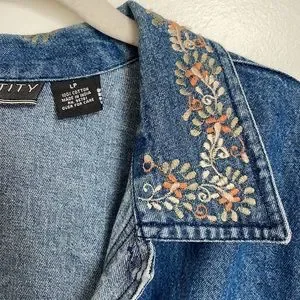Beautifully embroidered vintage chambray shirt jacket. Soft and worn in nicely. Missing 1 button but not noticeable.