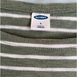 details: green and white stripes, sleeves are 3/4 length, tie in front, wide neck