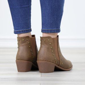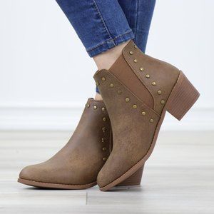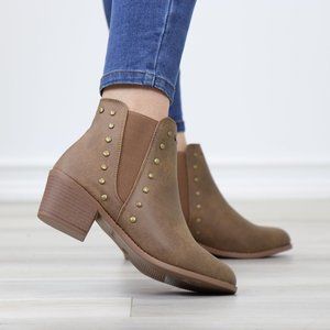 Chelsea Pointed Toe Low Heel Ankle Boots Metal Studs Tan Synthetic Leather