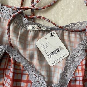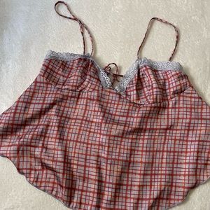 Delicate lace trims the neckline of a flowy camisole that ties at the back. 100% polyester Machine wash, tumble dry Imported