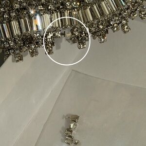 Condition: Fair with imperfections. There is a small dirty spot on the inner side of the sole of the left heel. Some of the small connecting crystals on the front strap of the right heel are missing. Repair or replacement would be at the buyer’s discretion. Please review all photos for details and condition.