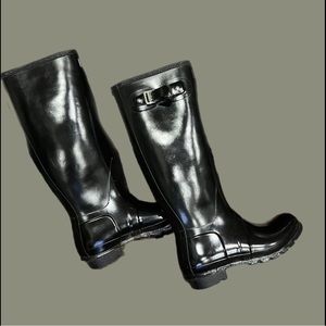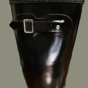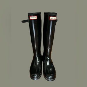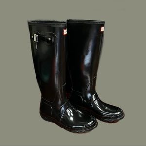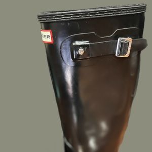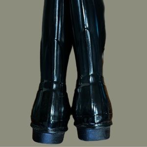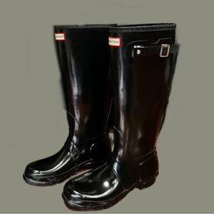 Perfect for wet weather conditions, this women's Rain Boot Boot has been at the heart of the Hunter Original brand since its introduction in 1956. Formed of natural rubber, each pair is made from 28 hand-cut parts and assembled over three days on an aluminium last bespoke to Hunter, before being vulcanized for superior protection. Featuring the Hunter Original tread pattern, and a comfortable polyester lining, this classic glossy black waterproof boot is a rainy-day necessity.