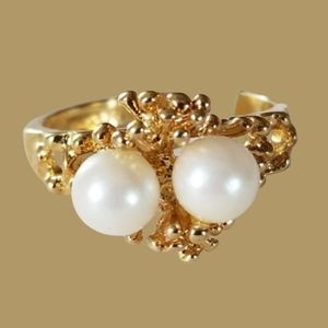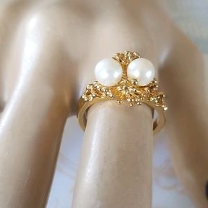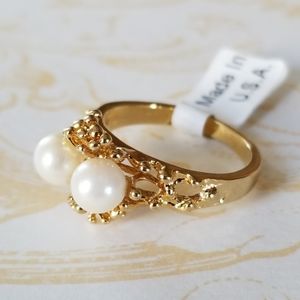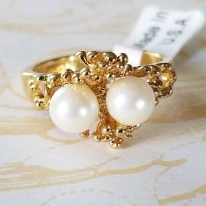 Dainty vintage ring features two irredescent faux pearls in a shiny 18k gold dipped electroplate setting.