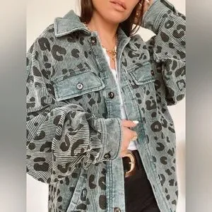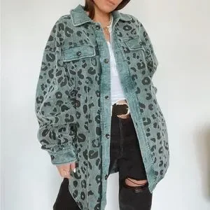 Shacket features an oversized silhouette, leopard print, relaxed fit, button down front, corduroy material, long puffy sleeves, and bust pocket.