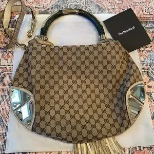 Beige and brown GG canvas Gucci Crest Indy hobo with gold-tone hardware, beige and tan python trim, single dark hunter green crocodile top handle with snakeskin trim, detachable flat shoulder strap, logo accent at front, chocolate suede lining, dual pockets at interior; one with zip closure and weighted tassel closure with bamboo accents at fold-over flap. Very Good. Minor brown mark on python trim, not visible when folded over and minor marks on interior beige lining of flap; minor surface scratches at hardware. Canvas is clean and free of marks and no odor. Comes with The RealReal dust bag and detachable python leather shoulder strap. Purchased via The RealReal three years ago and only worn twice. Limited Edition Gucci Bag, rare find.