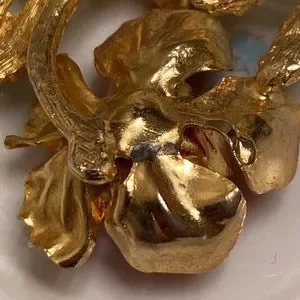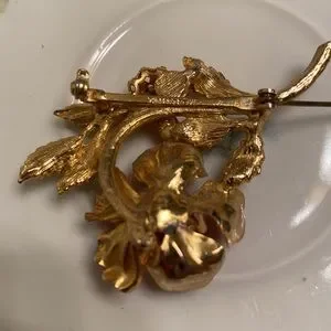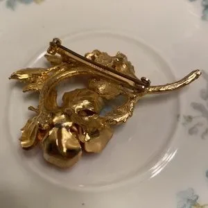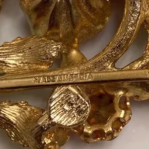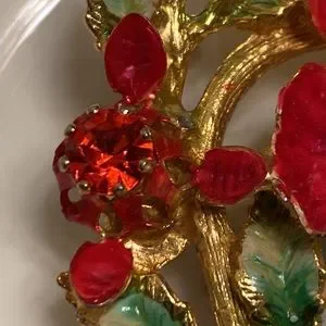 Pretty vintage Made in Austria brooch is a great size to decorate a lapel. The brooch is 2 1/2” x 1 1/2”. Great condition. Red enamel with green leaves. Two red rhinestones in good condition. Shiny gold back with a bit of tarnish on the pin. Signed Made in Austria. Bag 1
