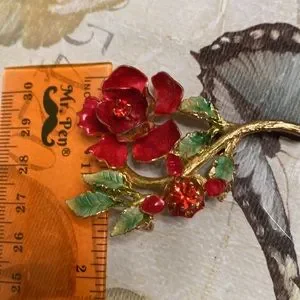 Vintage Made in Austria enamel rhinestone red flower brooch- 2 1/2” x 1 1/2”