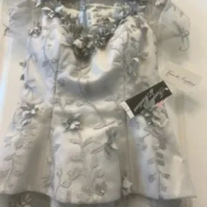 Beautiful Brand New Designer Gown. Silver Metallic Tulle with hand sewn flower appliques attached. Each flower is also adorned with a center grey pearl. This gown is fully lined. Netted sheer illusion sleeves can be removed to make the gown sleeveless giving it a totally off the shoulder look. This gown has never been worn or altered and still has all original tags attached. Will fit a size 4 / 6 Measurements are 30 1/2 Bust 27 1/2 Waist 36 1/2 Hips. Style # 3036. Made exclusively by Tina Di Martina Designs in Hauppauge New York. Gown was purchased at Infinity Boutique in Boca Raton for $1800. Perfect dress for Mother of Bride/Groom.