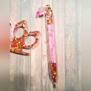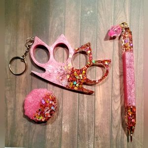 self defense keychain with matching phone grip and matching pen with a diamond charm. I can put a name on the pen and phone grip if you would like. just let me know after purchase what name or what you would like on them! rose gold in color