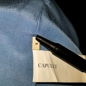 NWT from Revolve, Clara One Shoulder Mini Dress in Azure Blue by Capulet. Beautiful and perfect for summer weather, linen one shoulder dress with ruffle overlay. Hidden side zipper with eyelet closure. Measurements are approximate.