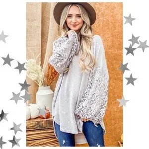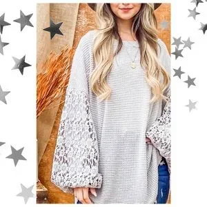 Waffle Knit High Low Tunic with Crochet Bubble Sleeves