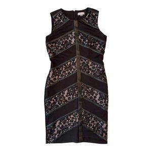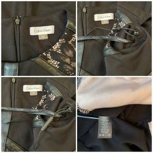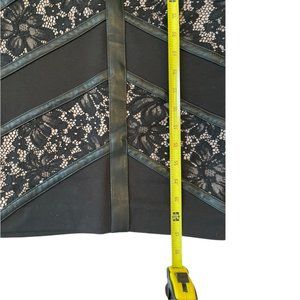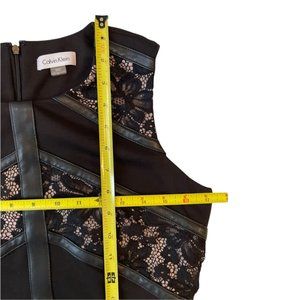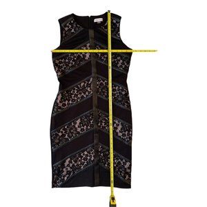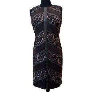 Mix Media Sheath Cd6p1437 In Black/nudeSheath silhouette, NEW with out tags. Mix media lace design. Faux leather contrast piping throughout. Round neckline. Sleeveless. Zipper closure at back. Lined. Shell 1: 77% polyester, 20% rayon, 3% spandex; Shell 2: 90% polyester, 10% spandex; Shell face: 100% polyurethane; Backing: 100% polyester; Lining: 100% polyester. Hand wash cold, dry flat. Imported. Measurements: 17" (armpit to armpit), 37" in length.