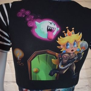 Black and white horizontal striped crop top with Mario trim, and on the back a graphic of Princess Peach and Boo Busters