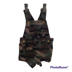 - Shortalls: 100% Cotton, Pull-on styling; adjustable straps; two side pockets; mock fly; camo print; super-soft feel