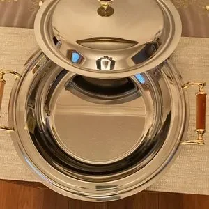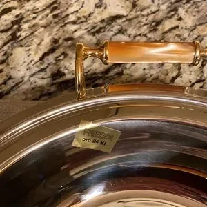 Vintage MCM Stainless Steel Serving Bowl with covered Lid Made by Freddi Benito Giuseppe in Italy 18/10 Stainless Steel embellished handles with 24KT Gold. This Luxury Serve Ware is NWT sticker still inside bowl etched at bottom and comes with certificate of guarantee.