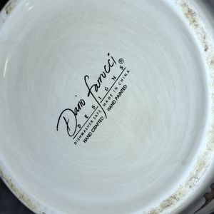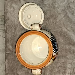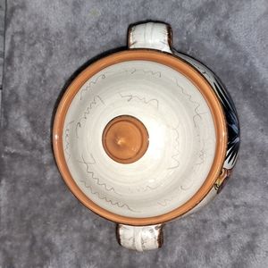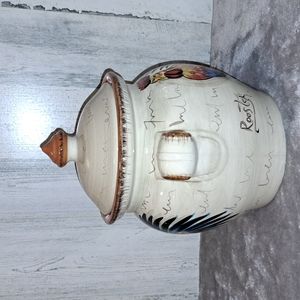 0113 Dario Farrucci Designs Rooster Canister, Multi-Colored, and measures 10" Tall with Lid.
