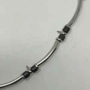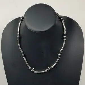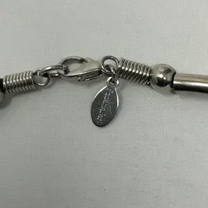 This vintage Panama Jack necklace features long stainless steel links connected by black rubber beads. There is a stainless steel lobster claw clasp that closes securely. Chain measures 20 inches.