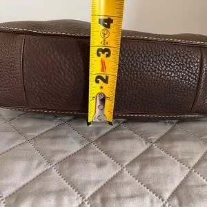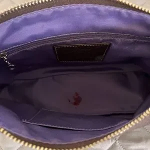 You will enjoy using this quality Coach soft pebbled leather bag everyday. Features exterior slip pocket and zip-top closure. Fabric lining has a small nail polish stain (shown in picture). Interior zip pocket and a slip pocket. A little (re)love goes a long way!