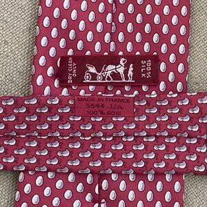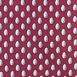 Color & Pattern: Burgundy Red w Eggs and Fun Little Chickens on Farm. This Hermes Tie is a Twillby Tie - which has two different Patterns on the same tie. Eggs on the mail blade, and chickens / chicks on the small part of the tie.