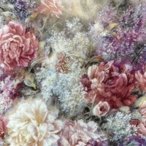 Magic Makers Plate by Lena Liu, Flowers and Fairies Produced by W.L. George, 1993. Plate number 18898F, 8" diameter. Fairy wing border. Colors of flowers are burgundy, blue, cream, teal, rose, mauve, purple and gold accents. This collectible plate is in excellent condition, no chips, scratches or cracks.